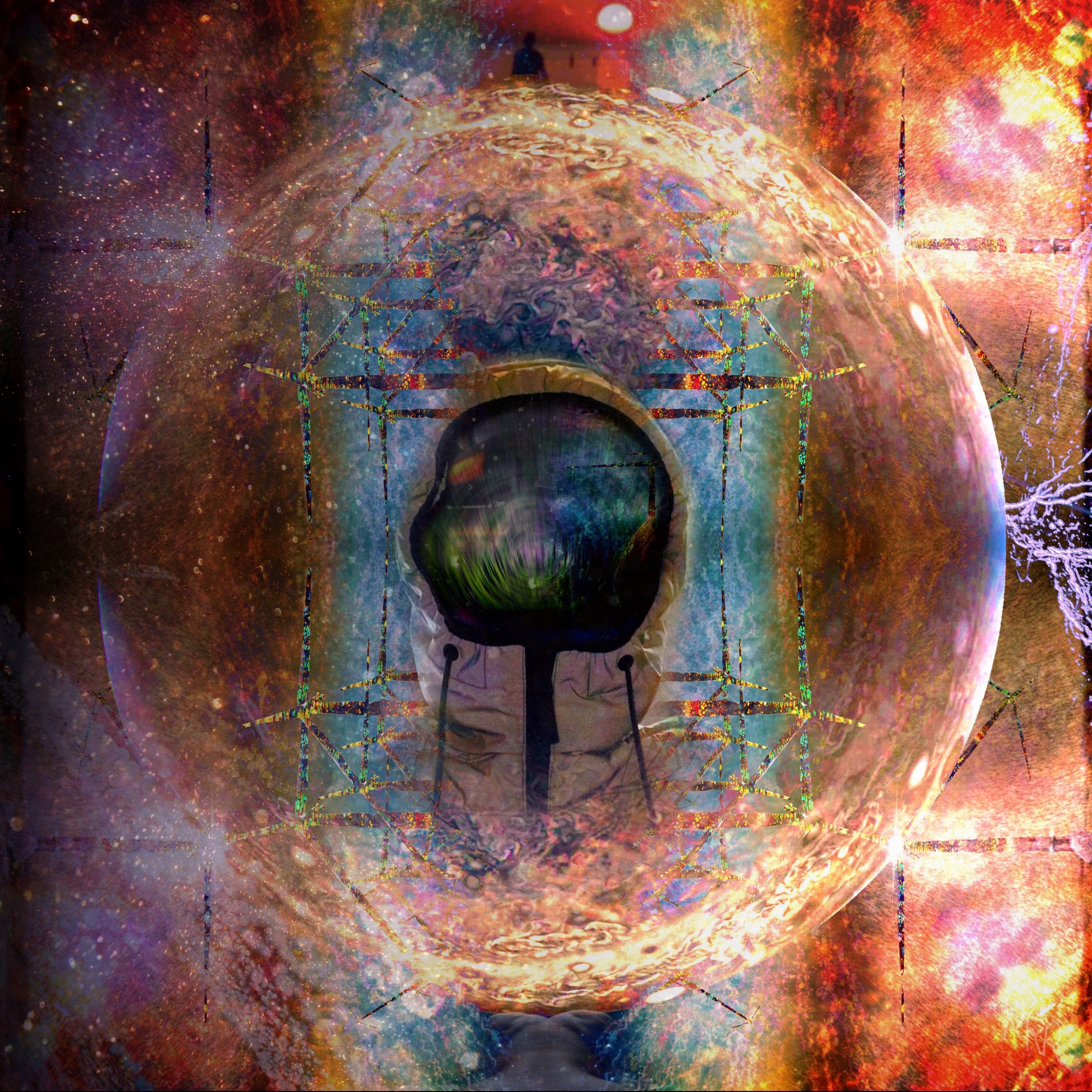 The depiction of a faceless entity in front of a tesseract of light comprised of more composited images to form the planet Jupiter as seen from the Juno space craft.