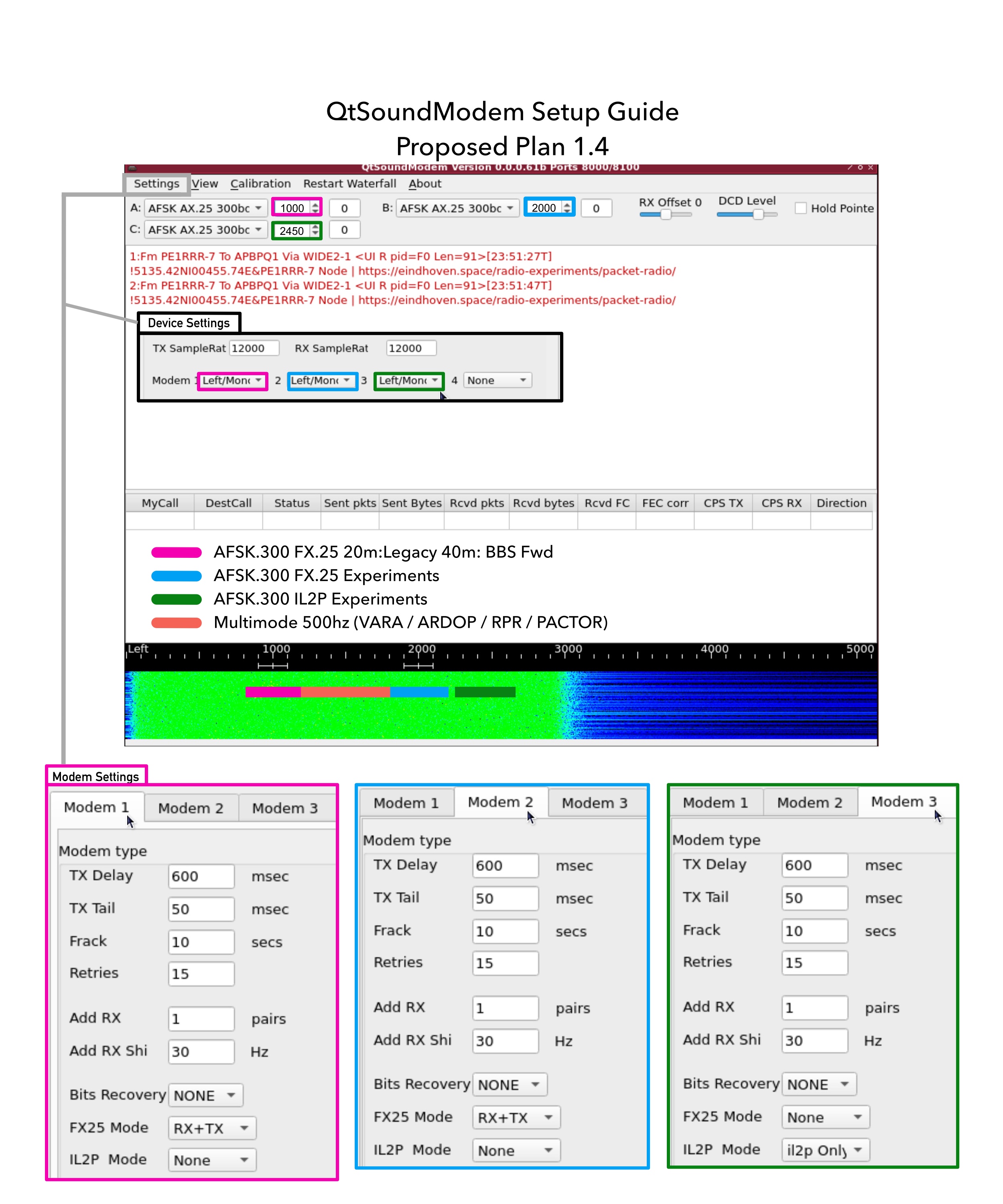 Please note these are subject to change as we are in the process of testing viability of various new packet modes, on paper they appear to be 200Hz wide but in reality packet AFSK is actually closers to 400Hz, and BPSK / QPSK is ~450Hz. At present, AFSK 300 IL2P at 2250Hz does overlap with AFSK.FX25 at 2000Hz but it remains working for now.