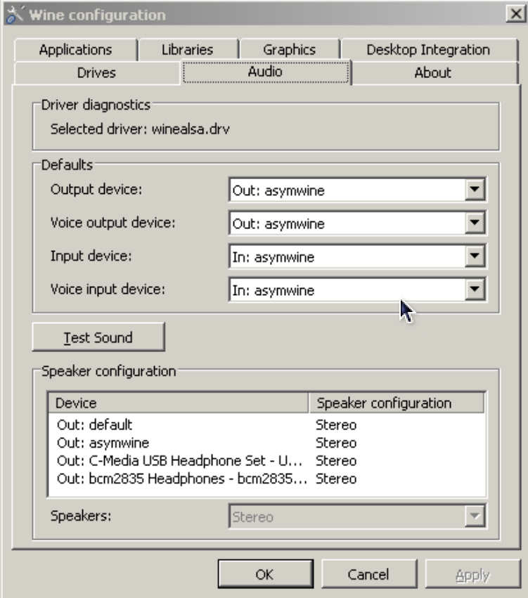 Now run “winecfg” again and navigate to the Audio tab, from the list of each input/output it should now be possible to select the newly appearing “asymwine” audio interface. If all things went to plan, be sure to do this action for each of the 4 fields.