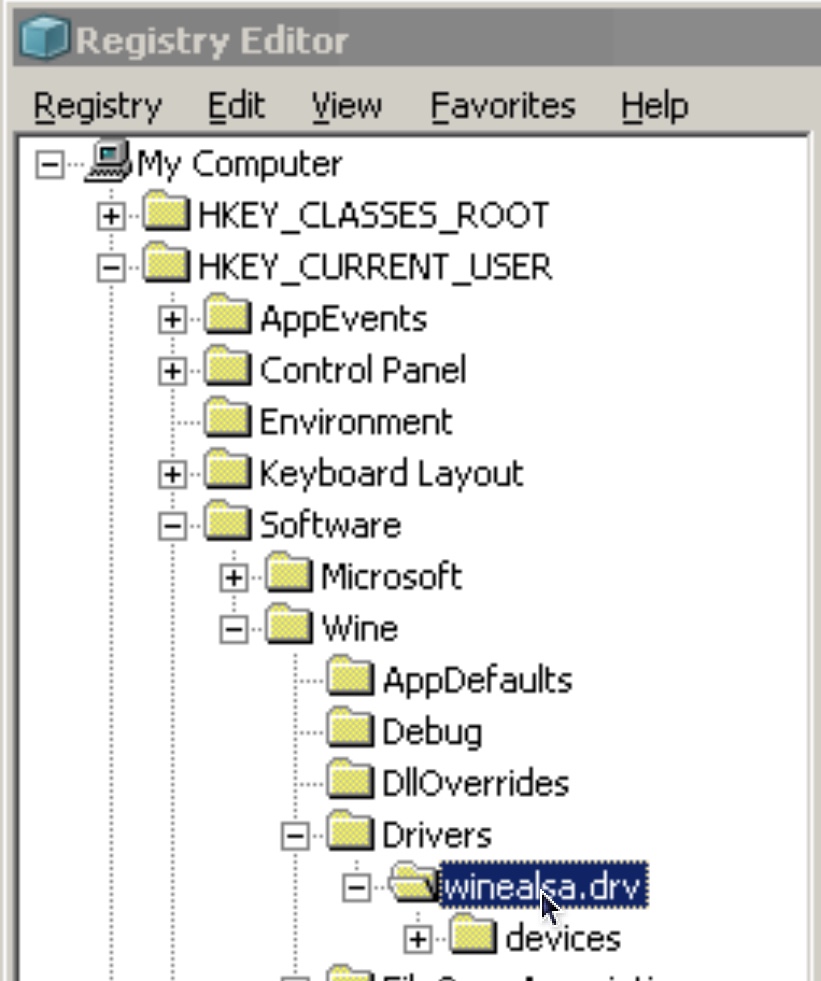 HKEY_CURRENT_USER\Software\Wine\Drivers\winealsa.drv