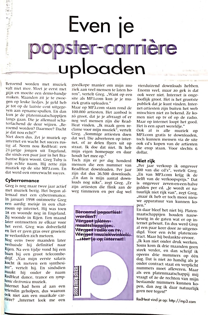 Niet doen dus. Zet je muziek op internet en wacht het succes rustig af. Neem nou RedHeat: een 21-jarige jongen it Engeland, die sinds een paar jaar in het Brabantse Rijen woont. Greg Tuby is zijn echte naam. Hij zette zijn muziek op de site MP3.com. En dat werd en onverwacht succes.