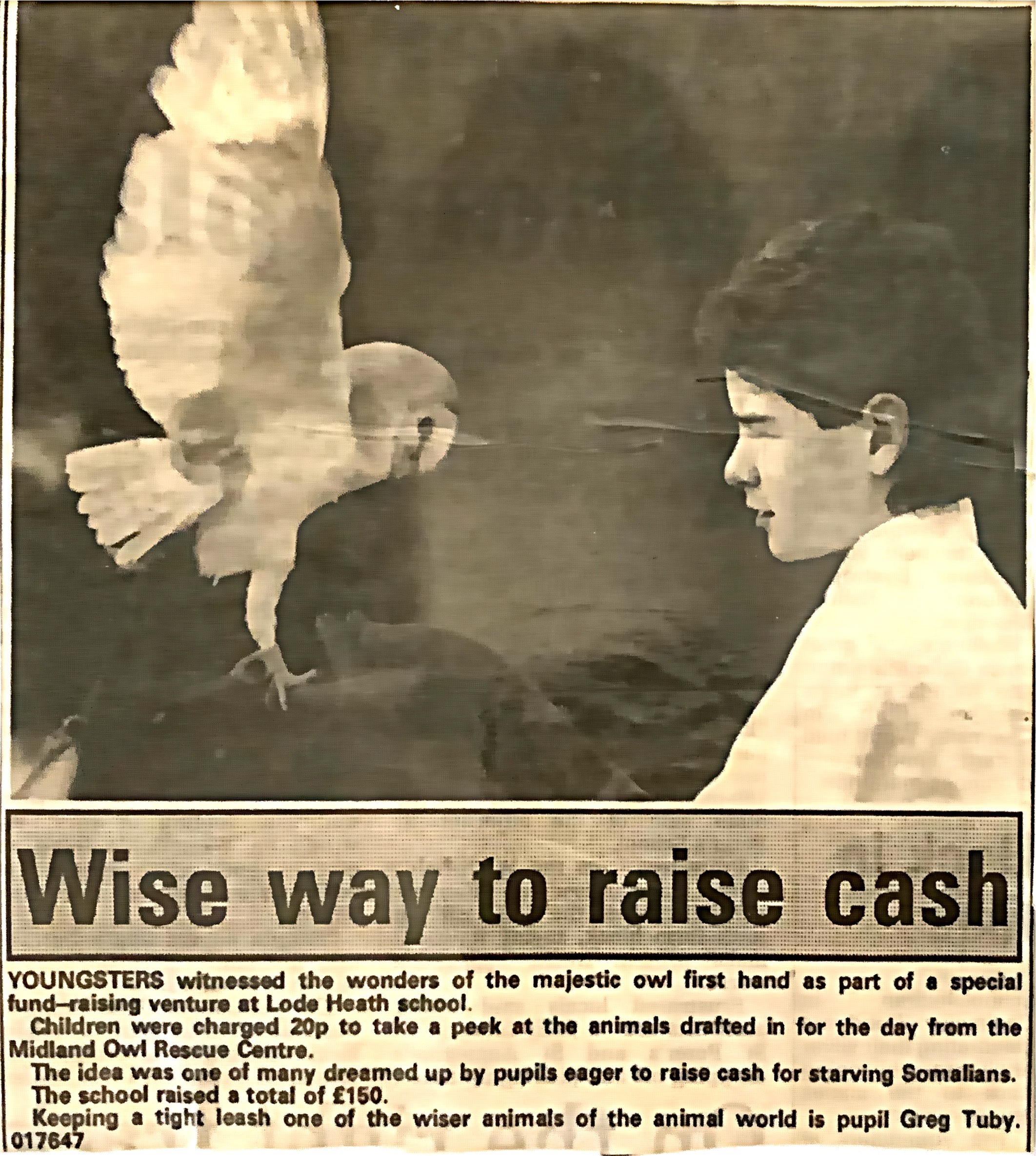 Opting to help victims in Somalia, the children set about drawing up a programme of fundraising events including a fashion show, a staff against pupils hockey match and a disco. An owl flying display was also organised with the heip of staff from the Midland Owl Rescue.